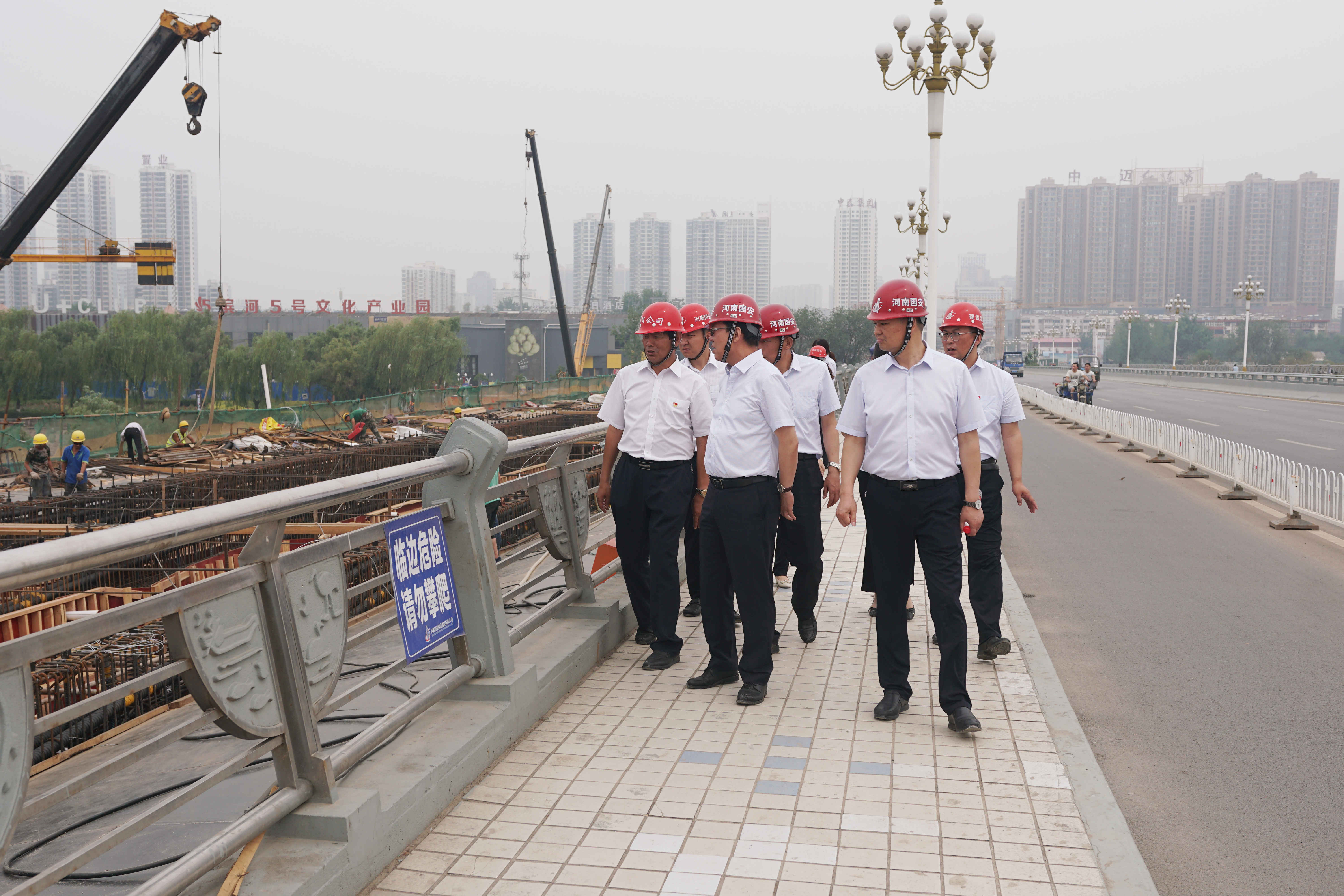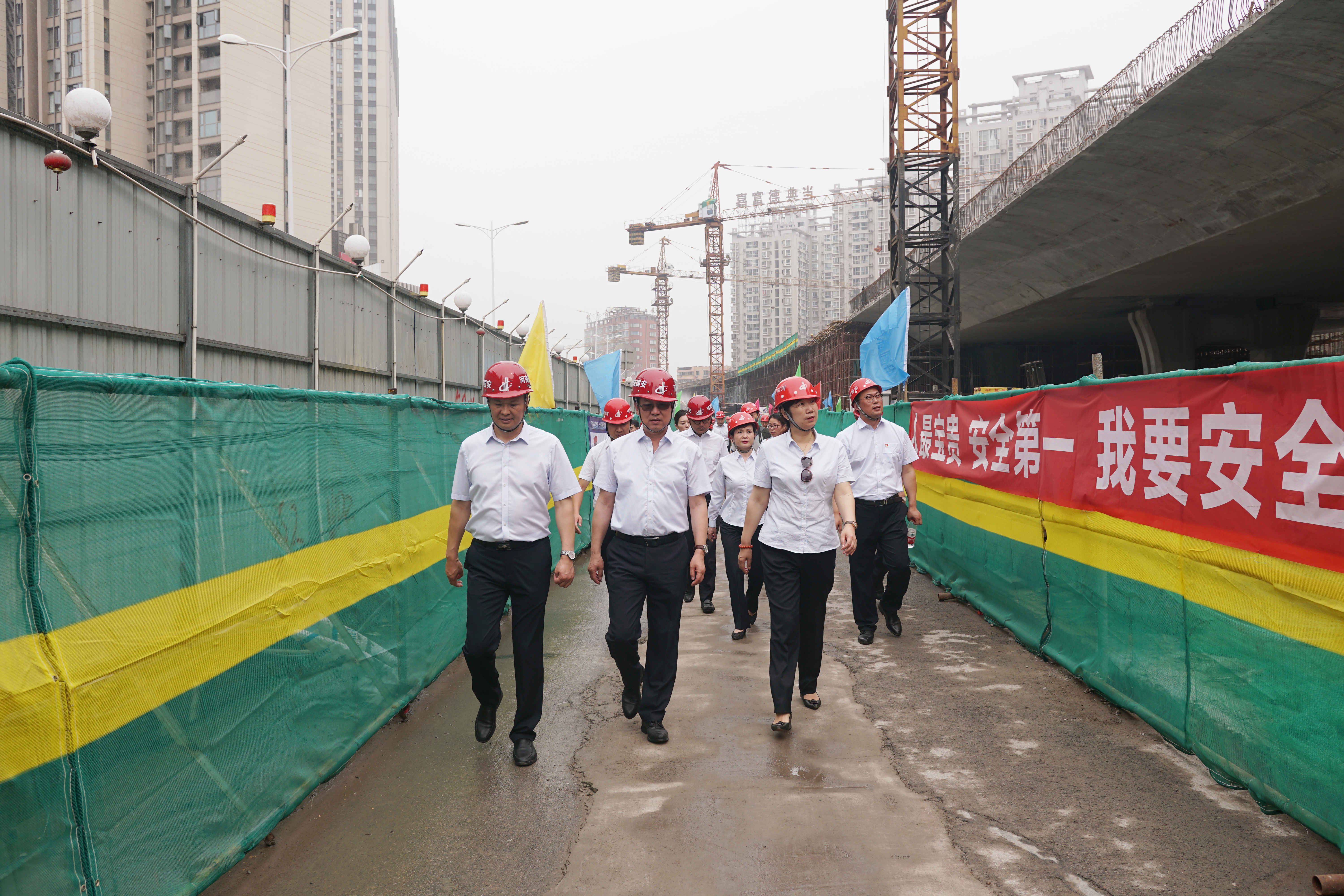 活動結(jié)束后,集團公司董事長衛(wèi)永勝一行領(lǐng)導(dǎo)對王城大道快速路建設(shè)工程項目視察,衛(wèi)董指出:王城大道快速路建成后,對改善我市中心城區(qū)交通具有重要意義,項目管理團隊在保工期、保質(zhì)量的同時,也一定要做好安全管控、揚塵治理等工作。